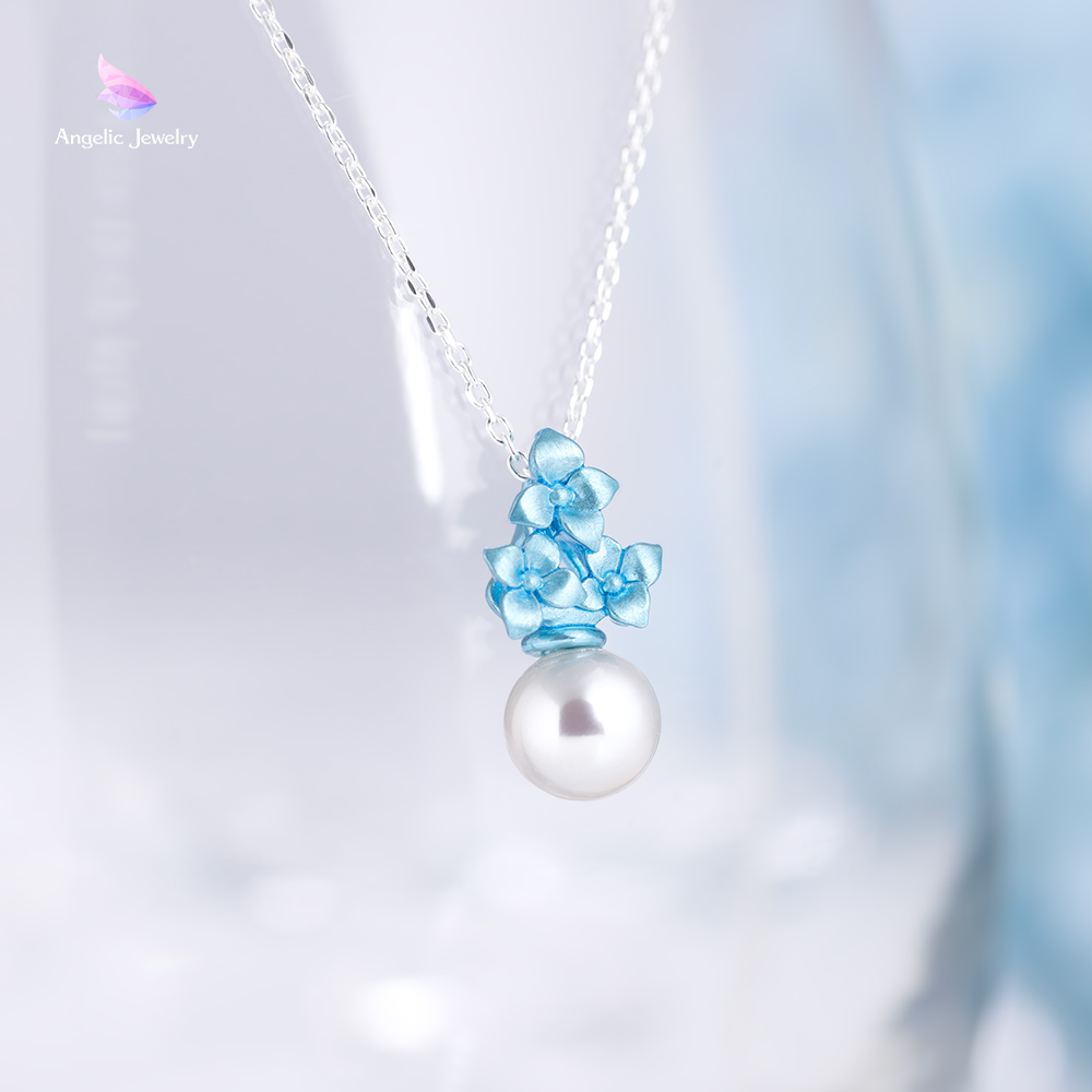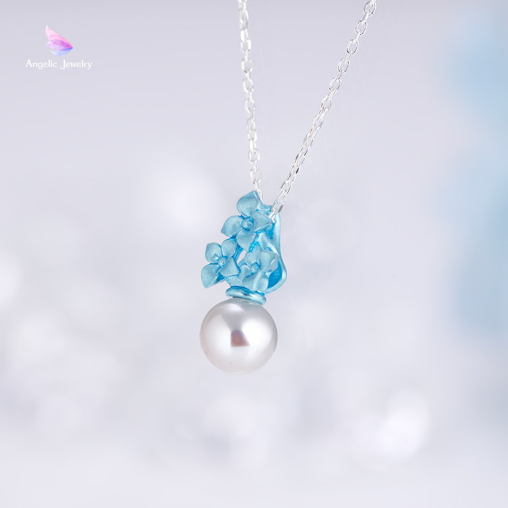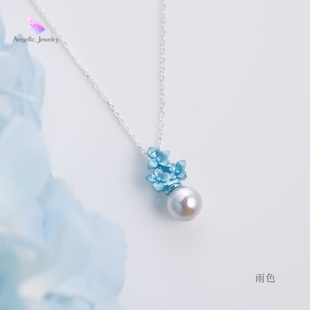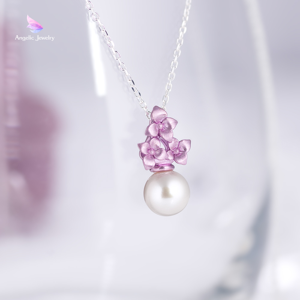 しっとりと咲く紫陽花と優雅なパールは胸元に上品さをもたらします。