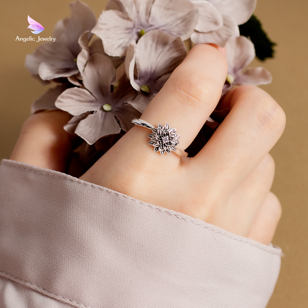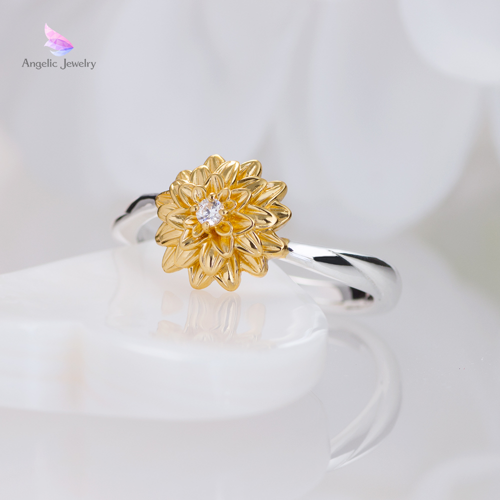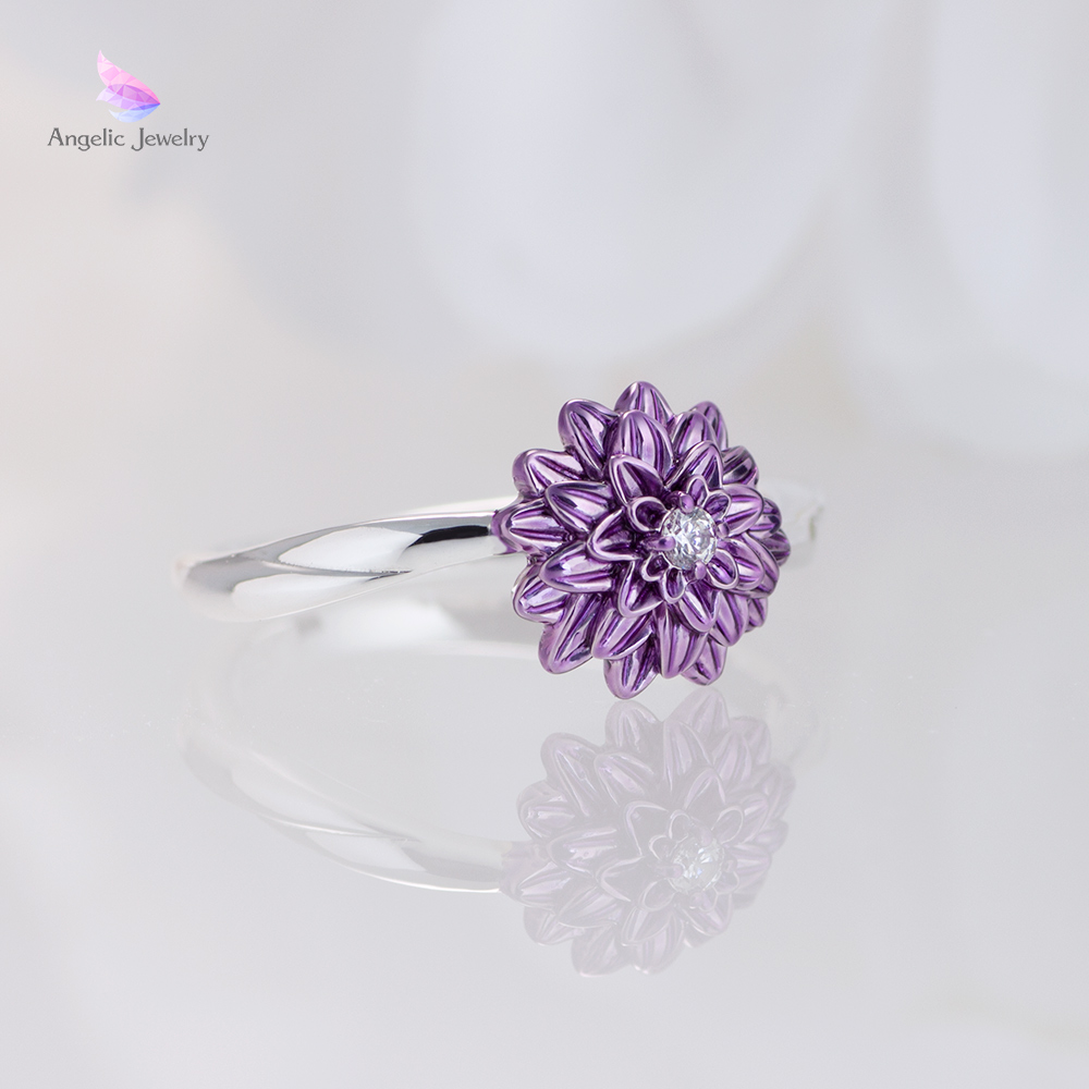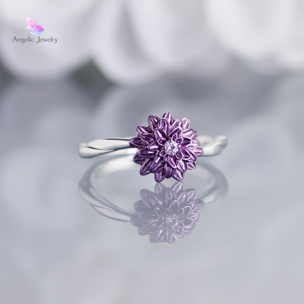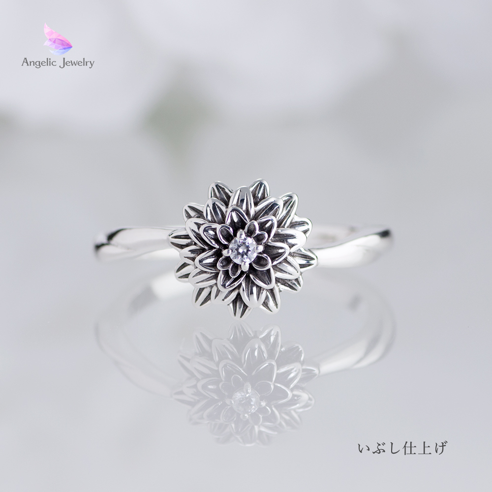 幾重にも重なる花びらが美しくも可愛らしいダリアのリング。