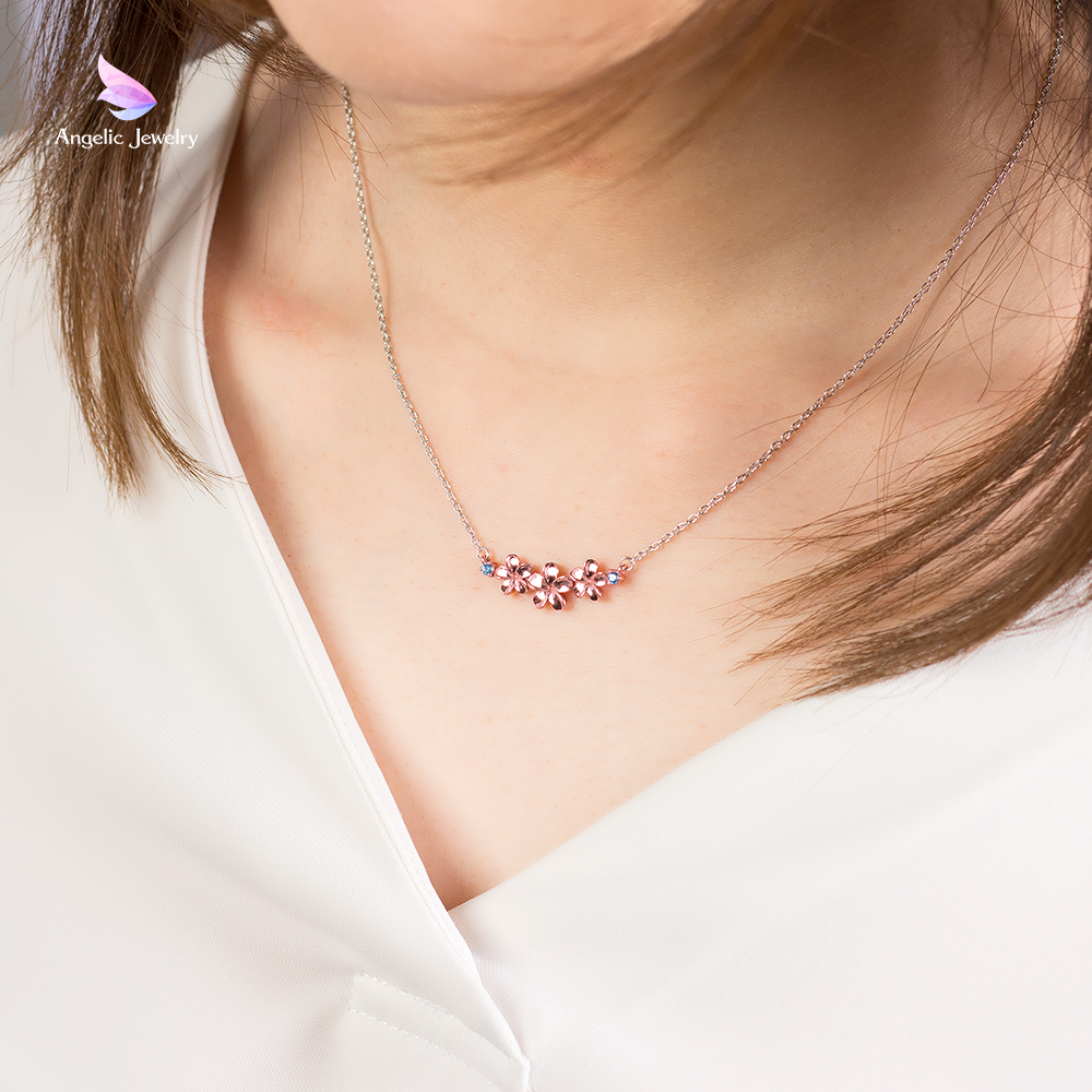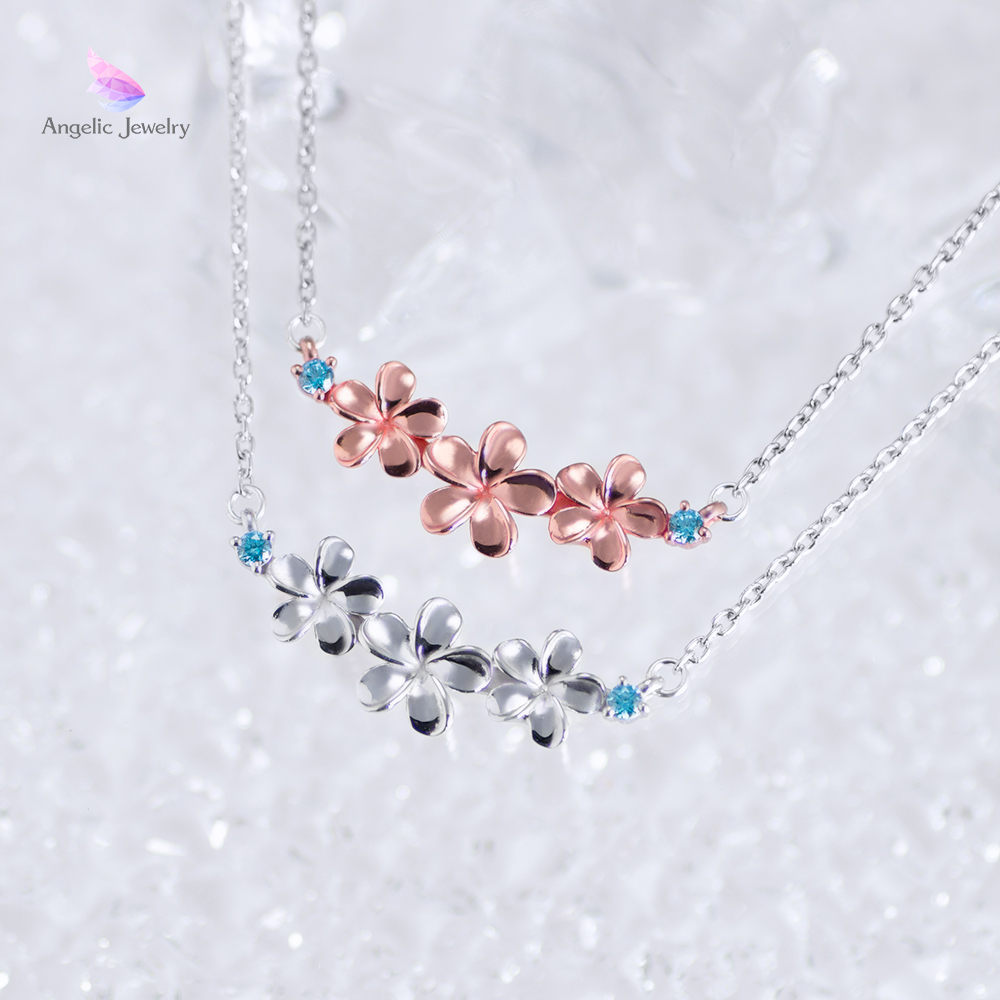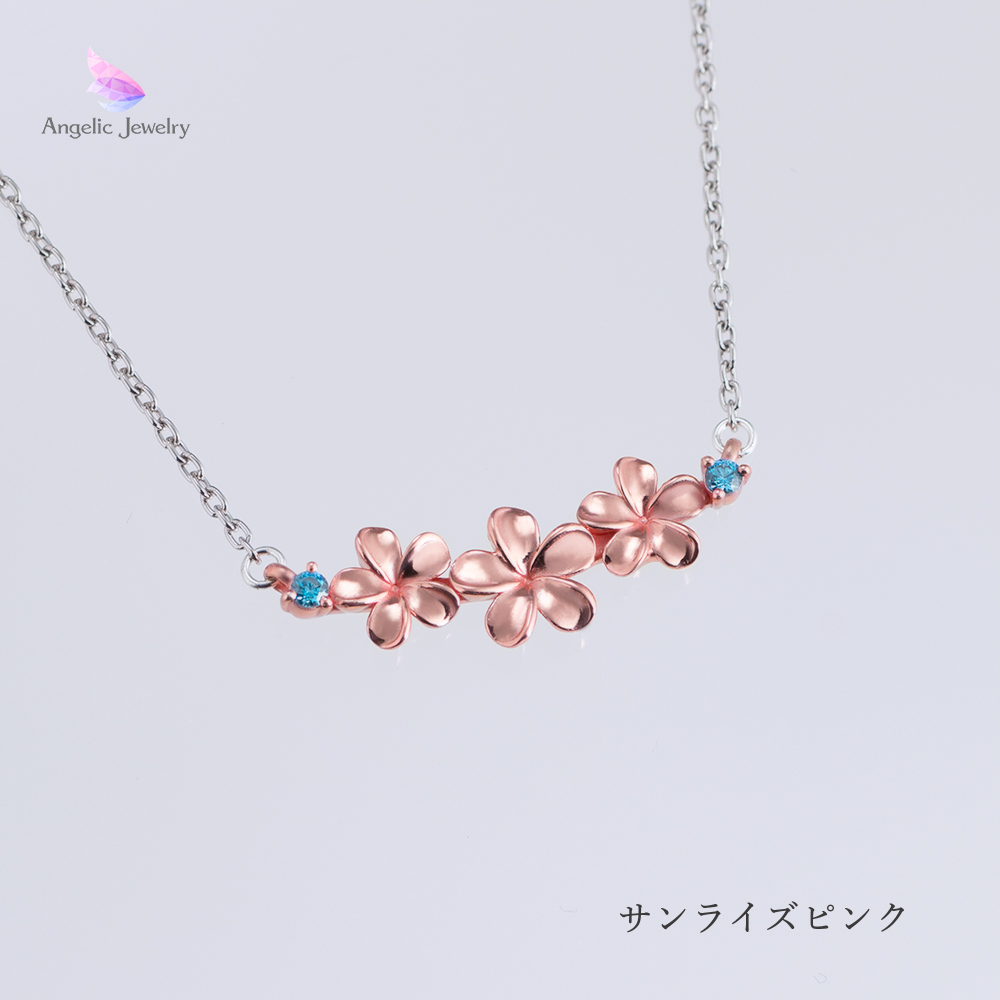 水に浮かぶプルメリアをイメージしたストーンと3連のプルメリアが可愛らしいデザインのネックレスです。