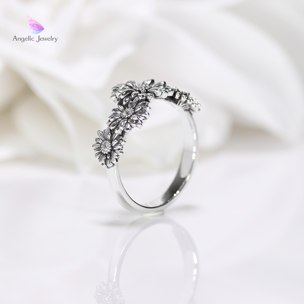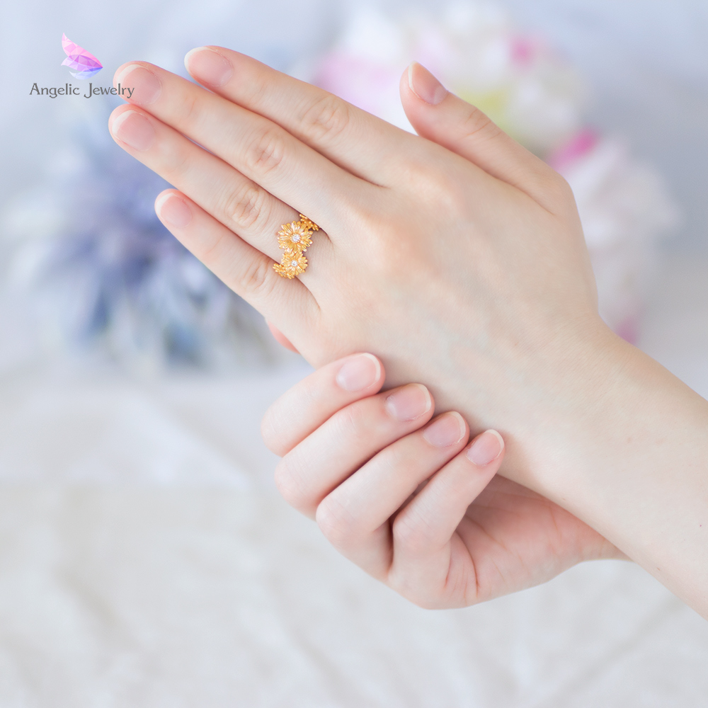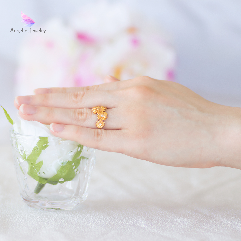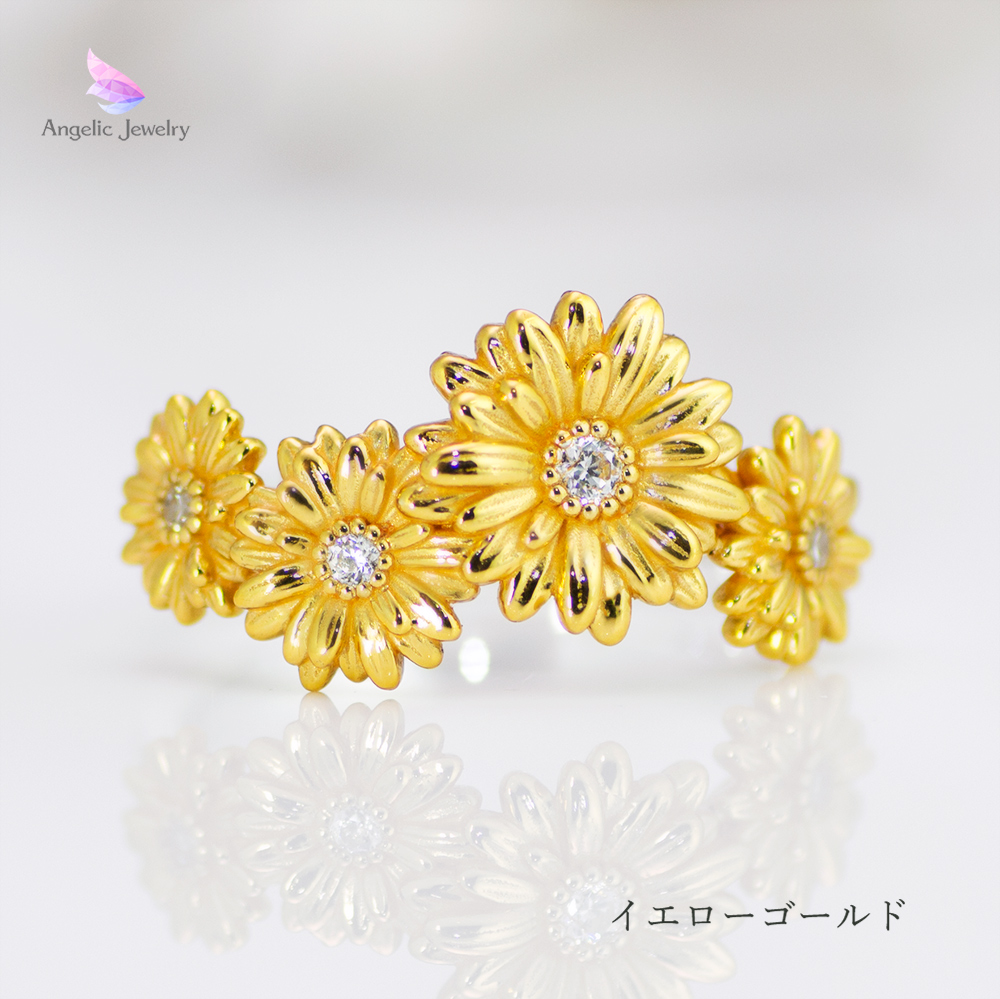 中央にはミルで囲うように留めたストーンを施し、四輪のガーベラが咲き誇る豪華なリングとなっております。