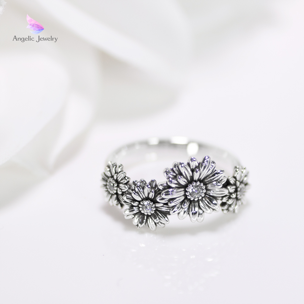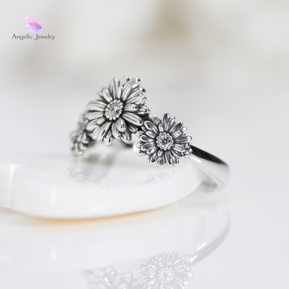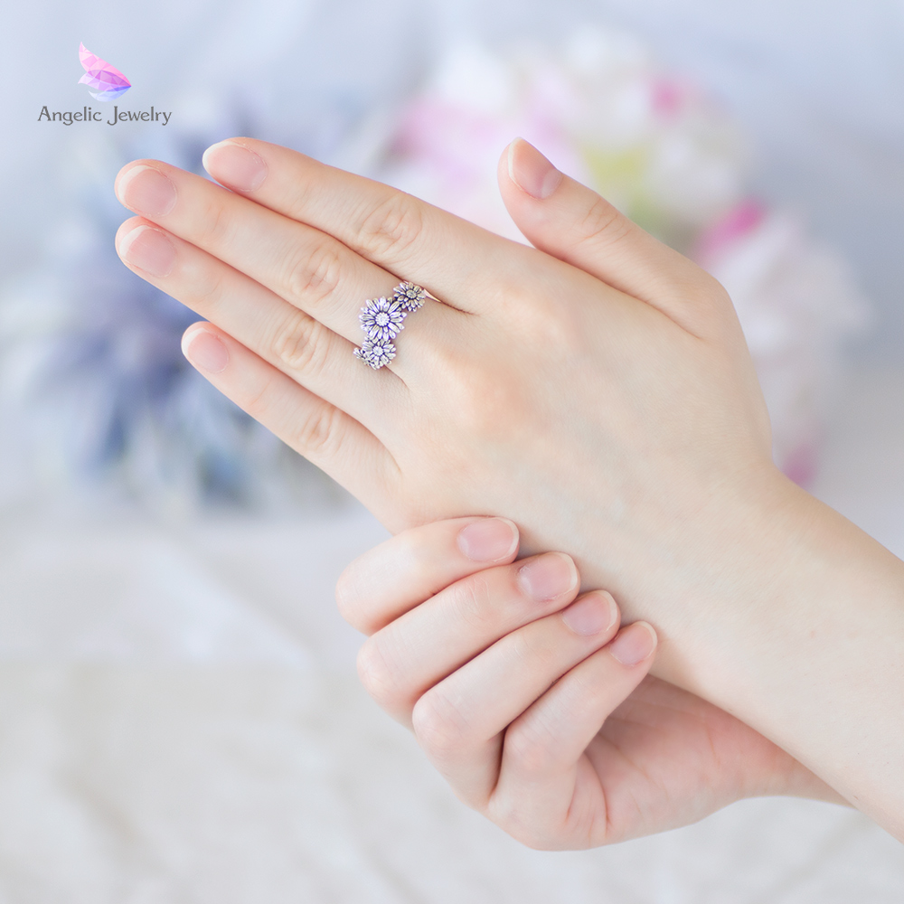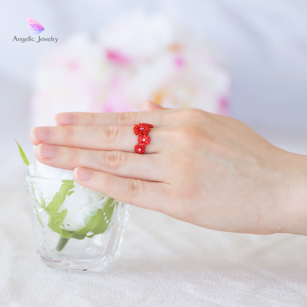 中央にはミルで囲うように留めたストーンを施し、四輪のガーベラが咲き誇る豪華なリングとなっております。