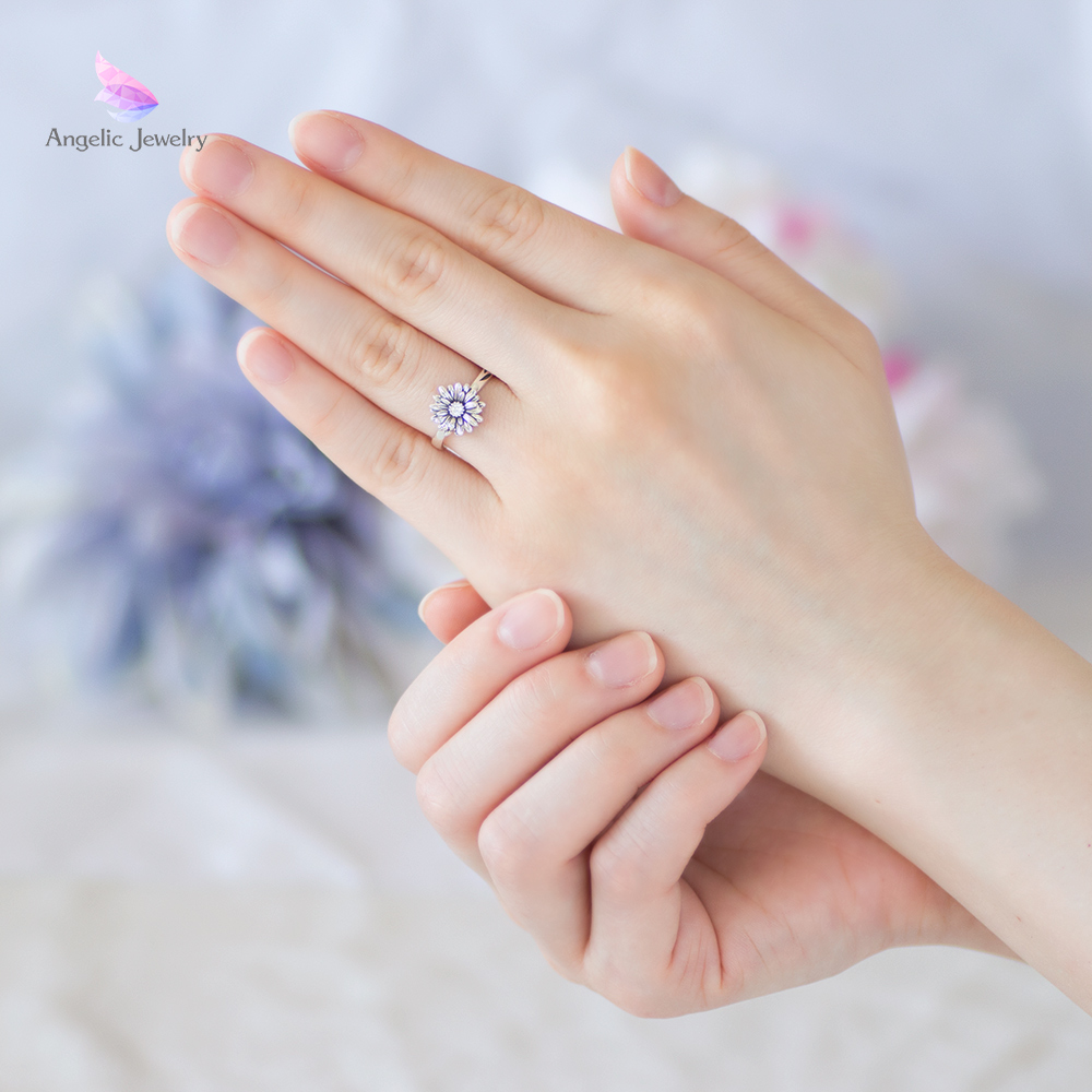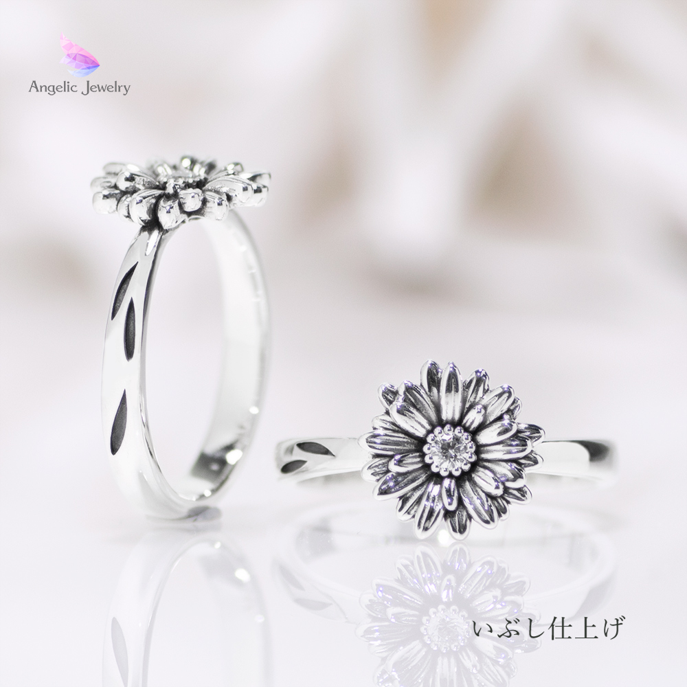 中央にはミルで囲うように留めたストーンを施し、側面にはこぼれ落ちる花びらがデザインされております。