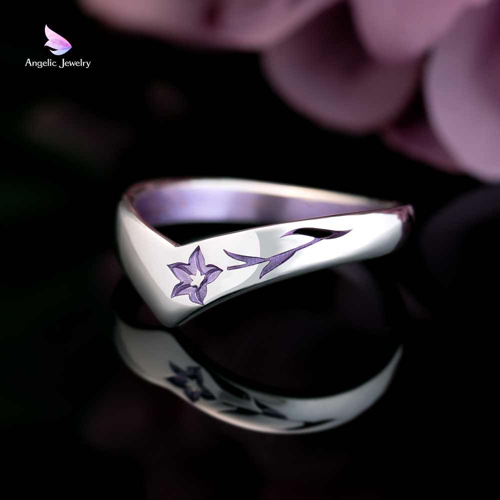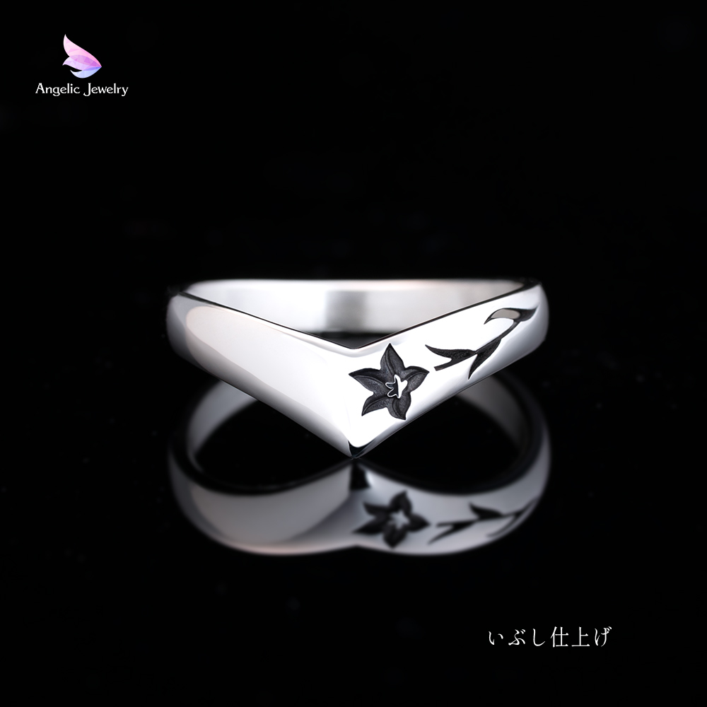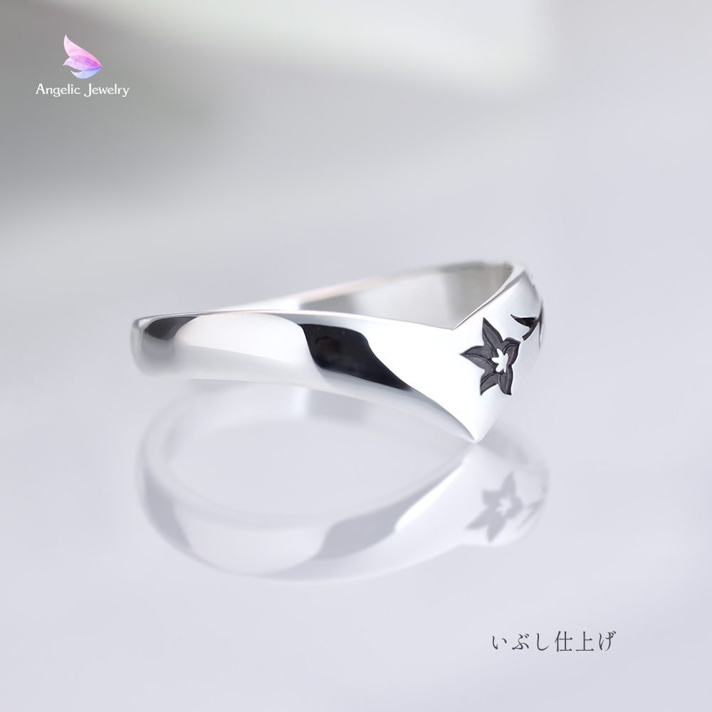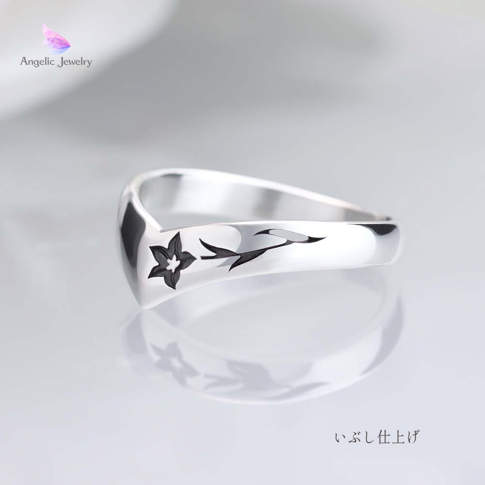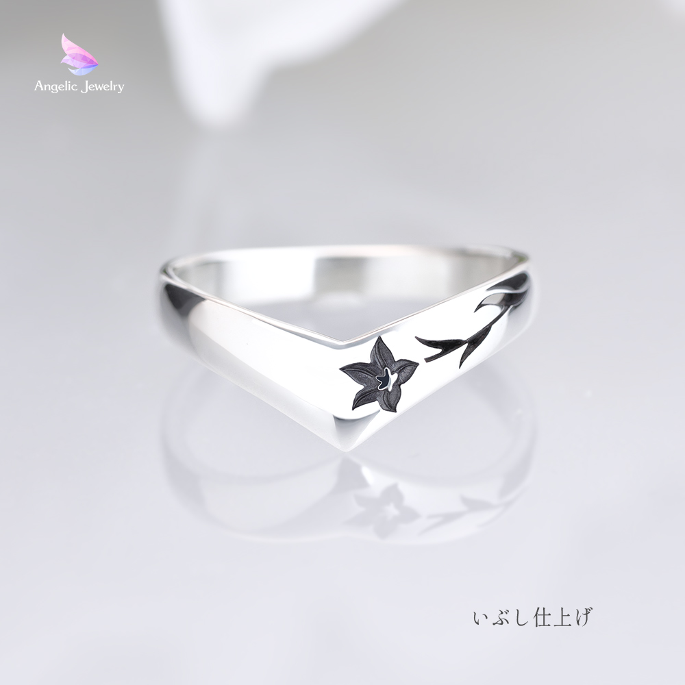 一輪の桔梗をそっと添えた、V字シェイプのリング。