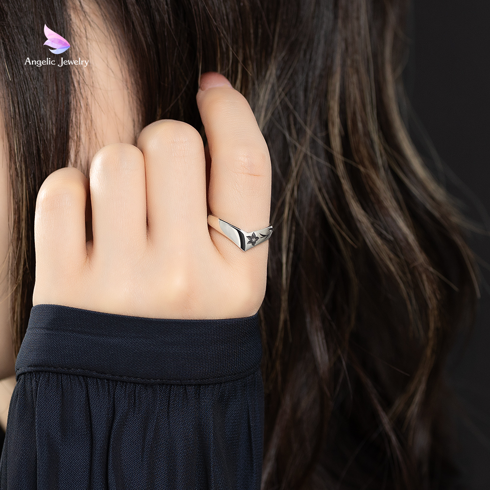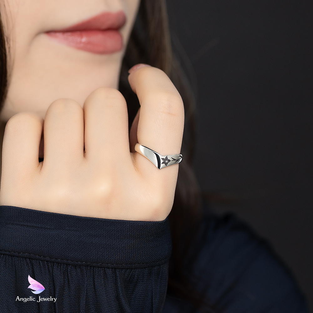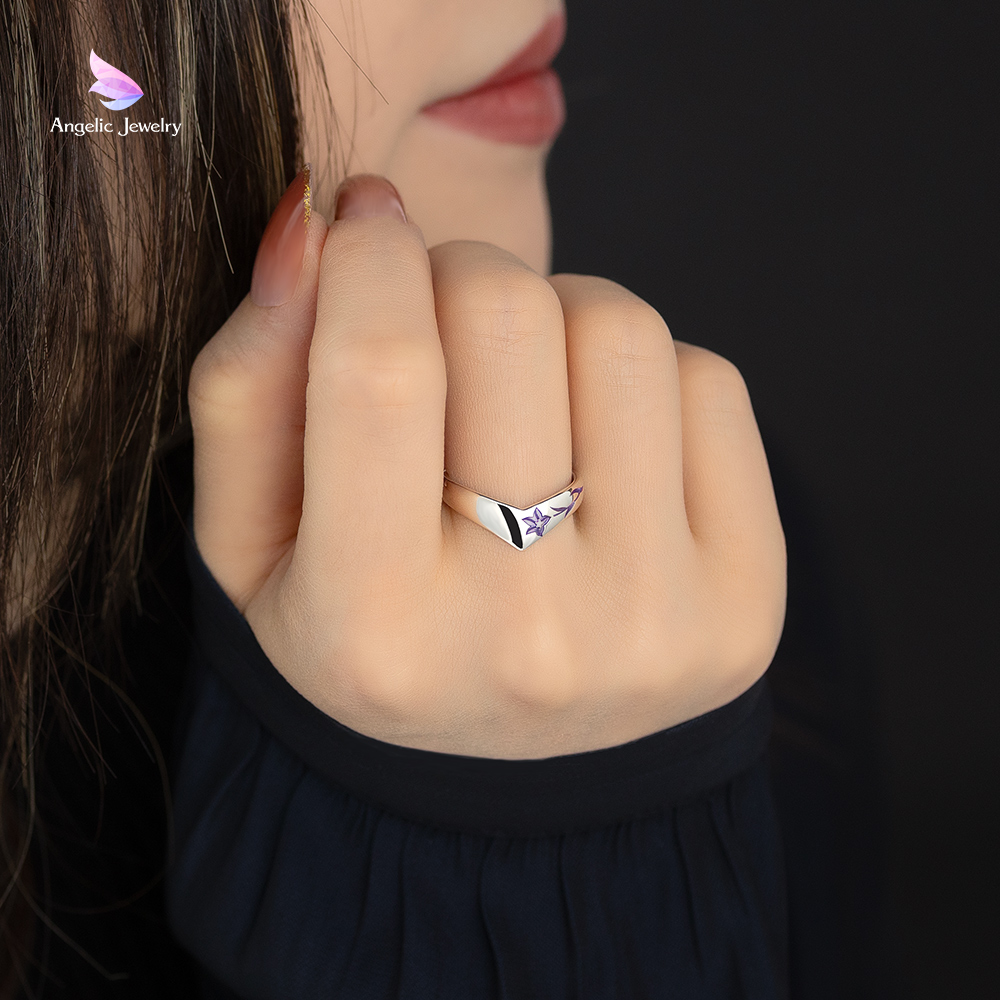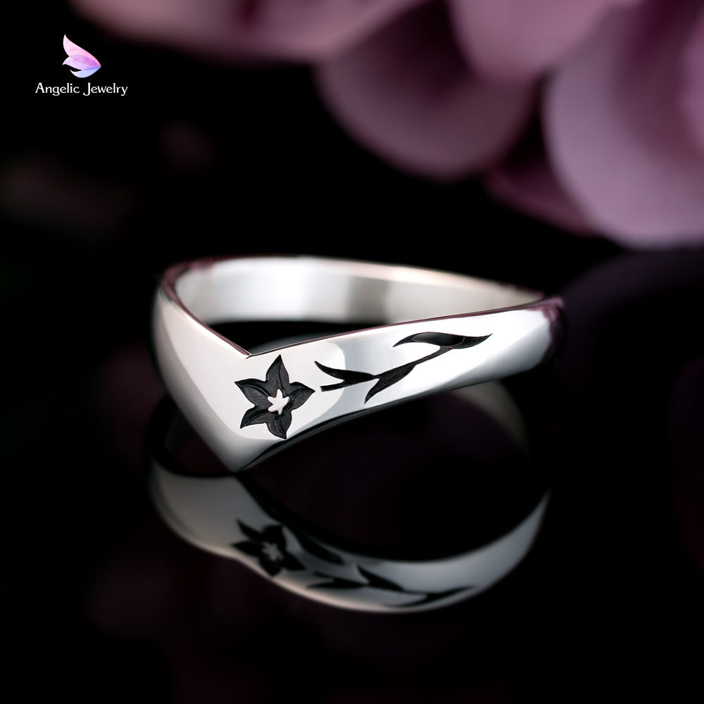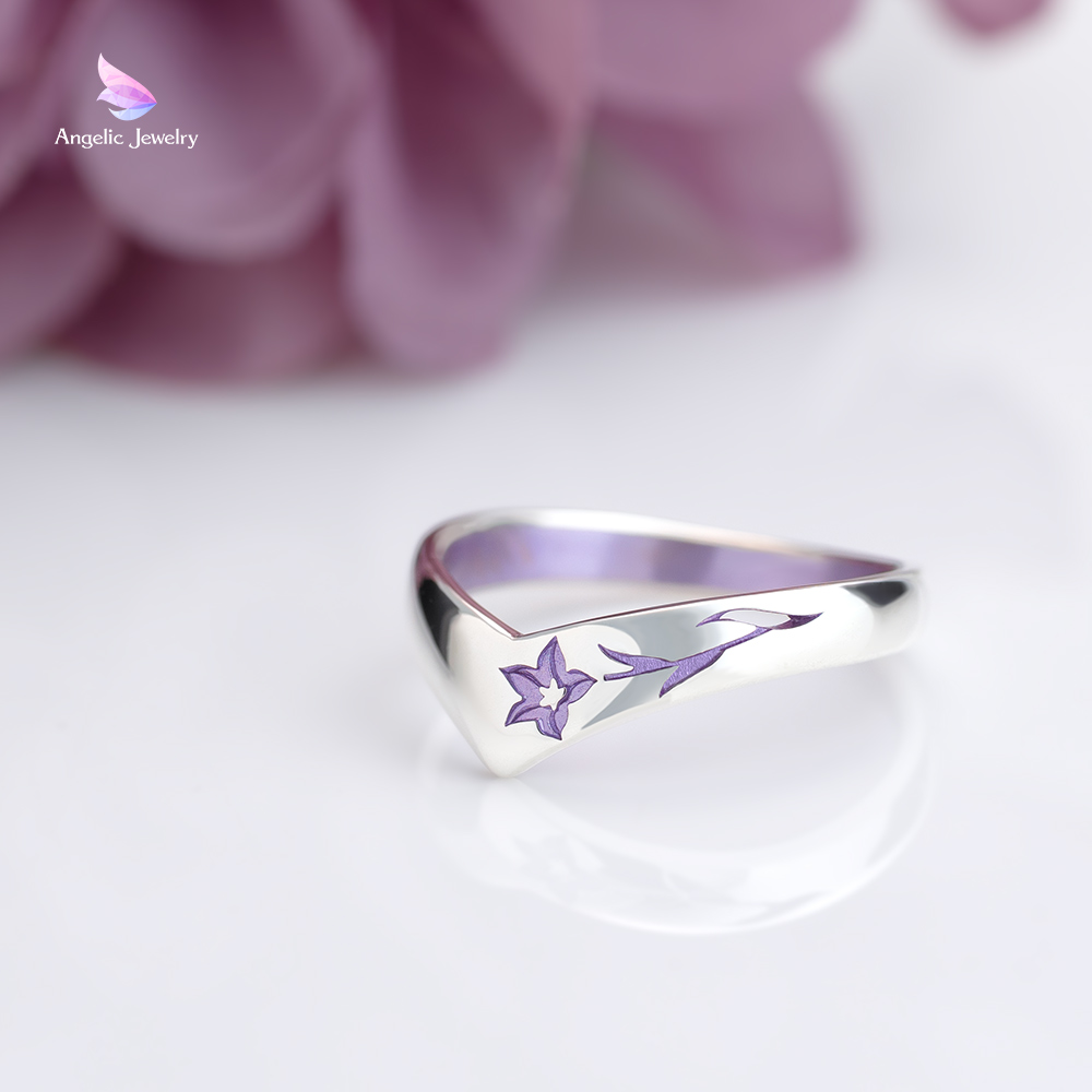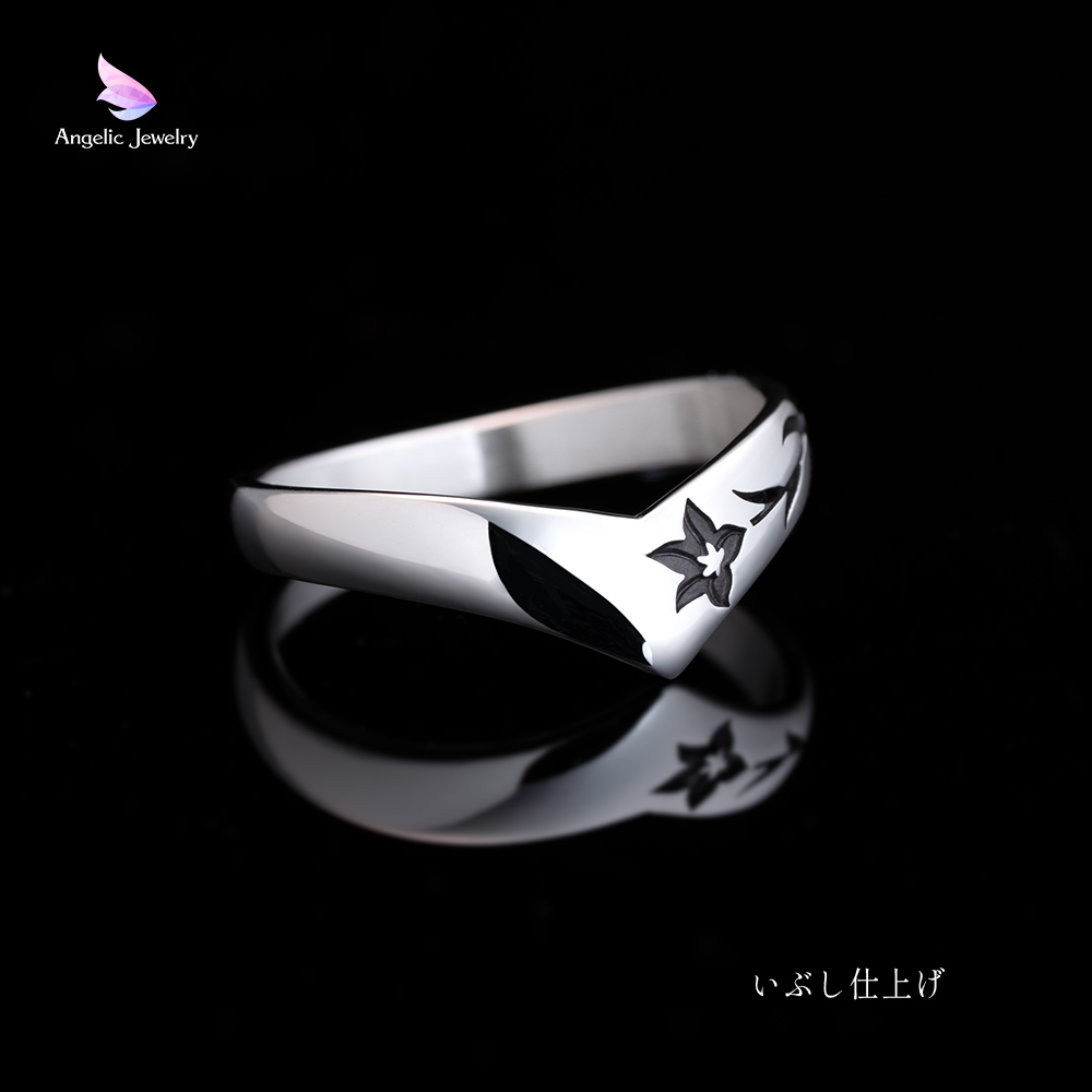 一輪の桔梗をそっと添えた、V字シェイプのリング。