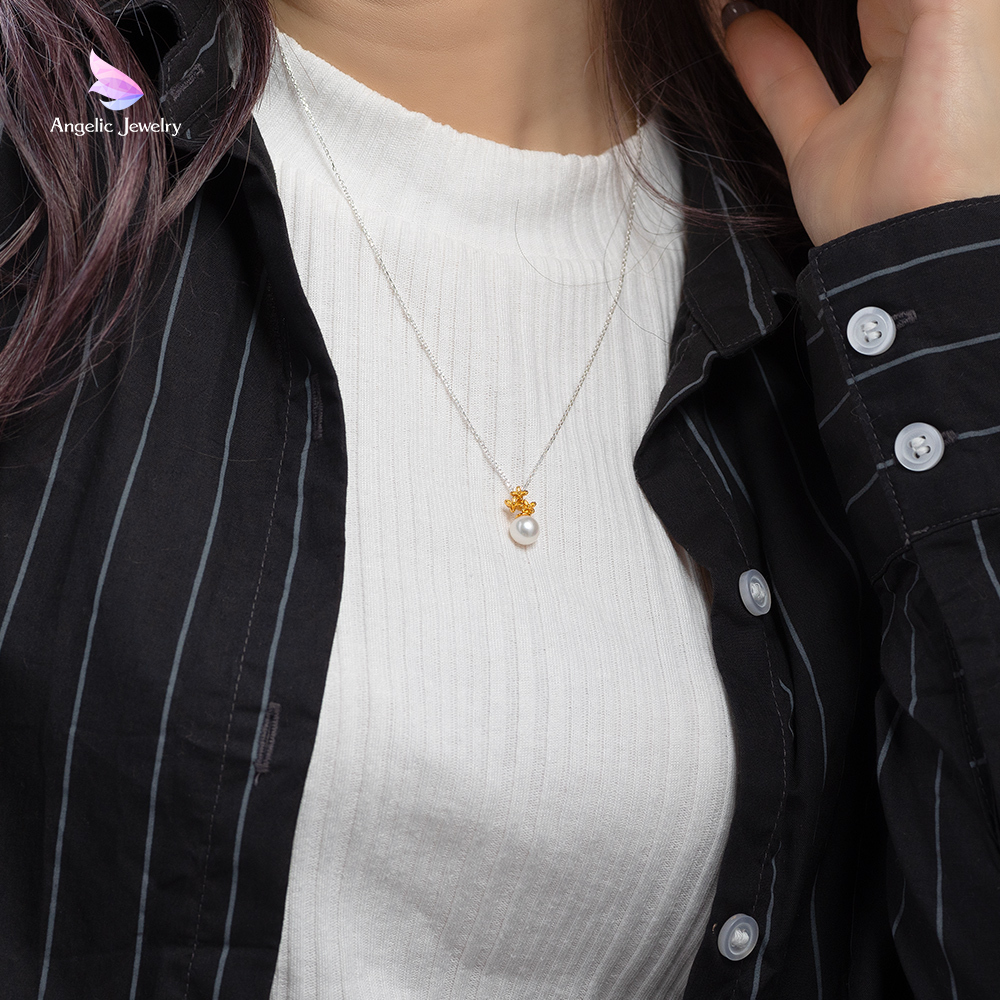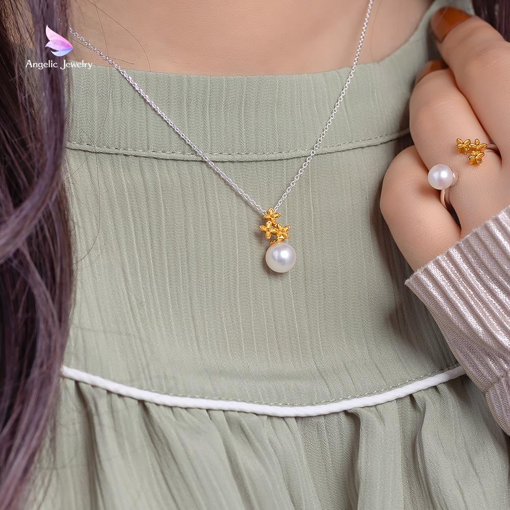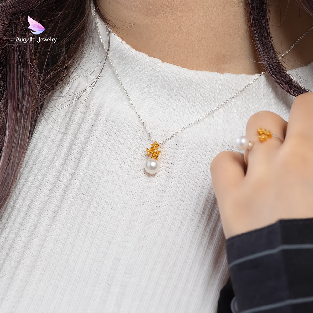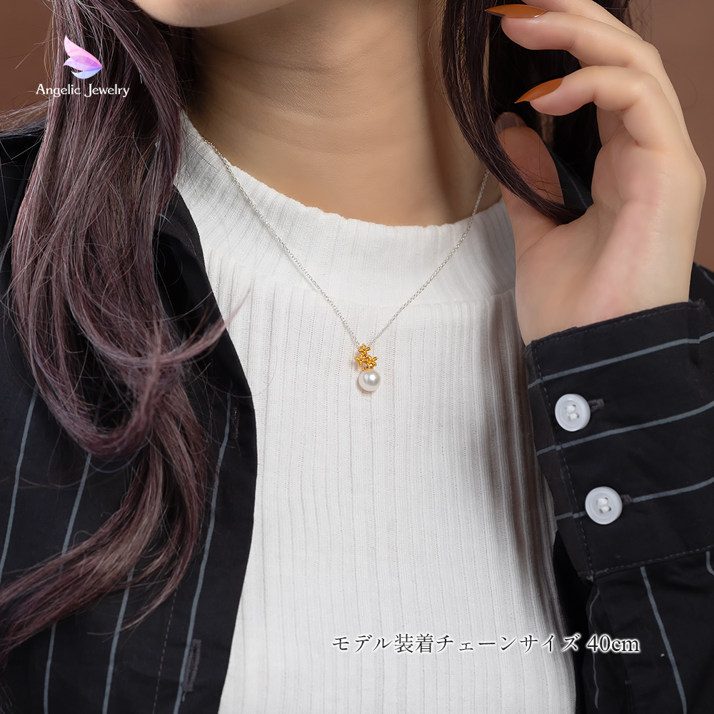 ゴールドにきらめく金木犀と優雅なパールは胸元に上品さをもたらします。