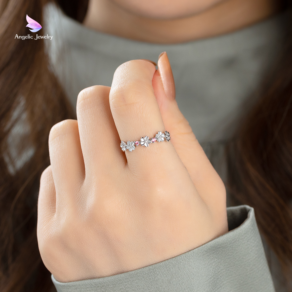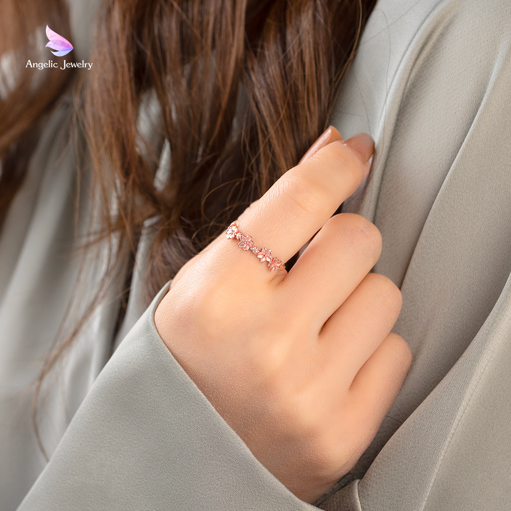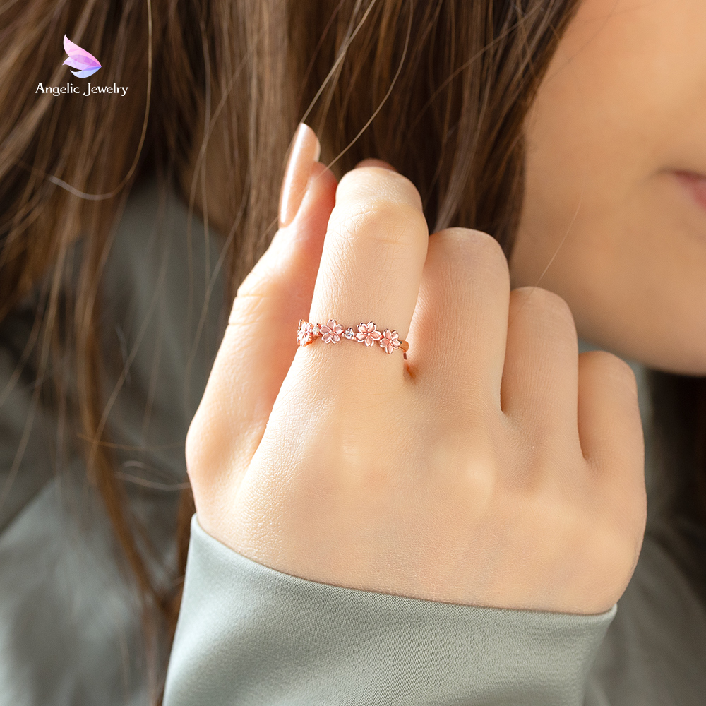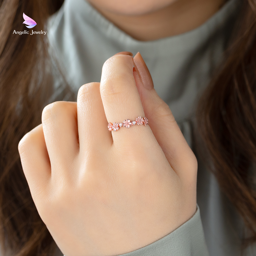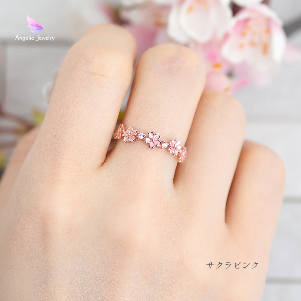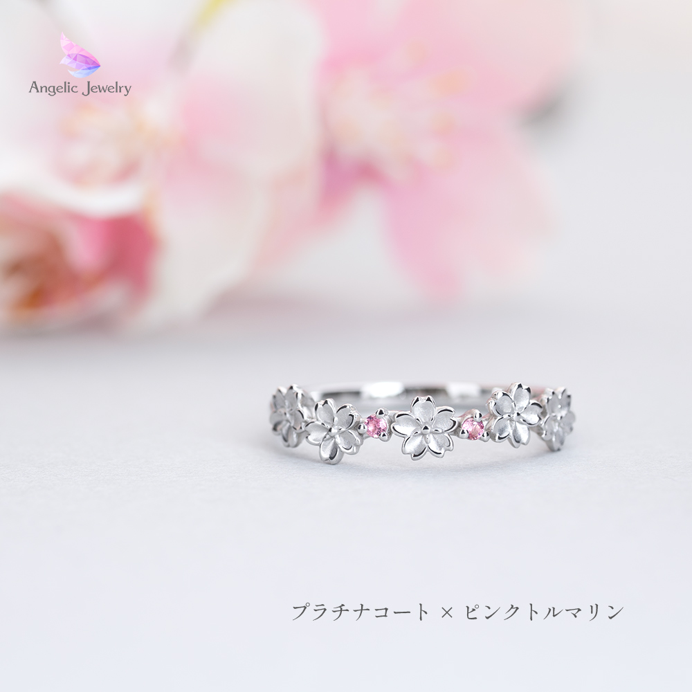 桜の間に添えたストーンが、朝露のように静かにきらめきます。